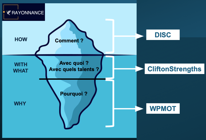 Au milieu, sous l’eau, toujours non détectable à l’oeil nu : l’outil du CliftonStrengths de Gallup décrit le “AVEC QUOI”, avec quels atouts innés-talents vous agissez.